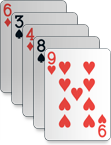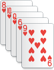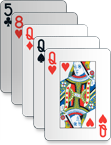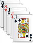This hand is made up with 3 cards of one value and two of another value e.g. 3 Jacks and 2 Eights. If more than one player has a Full House the winning hand would be the one whose 3 cards are of the highest value, or, failing that, whose 2 cards are of the highest value.